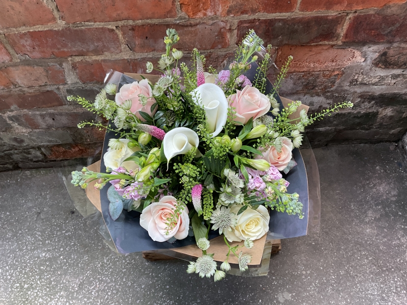 Cream and pink hand tied using a combination of seasonal flowers expertly hand tied in water and gift bag.